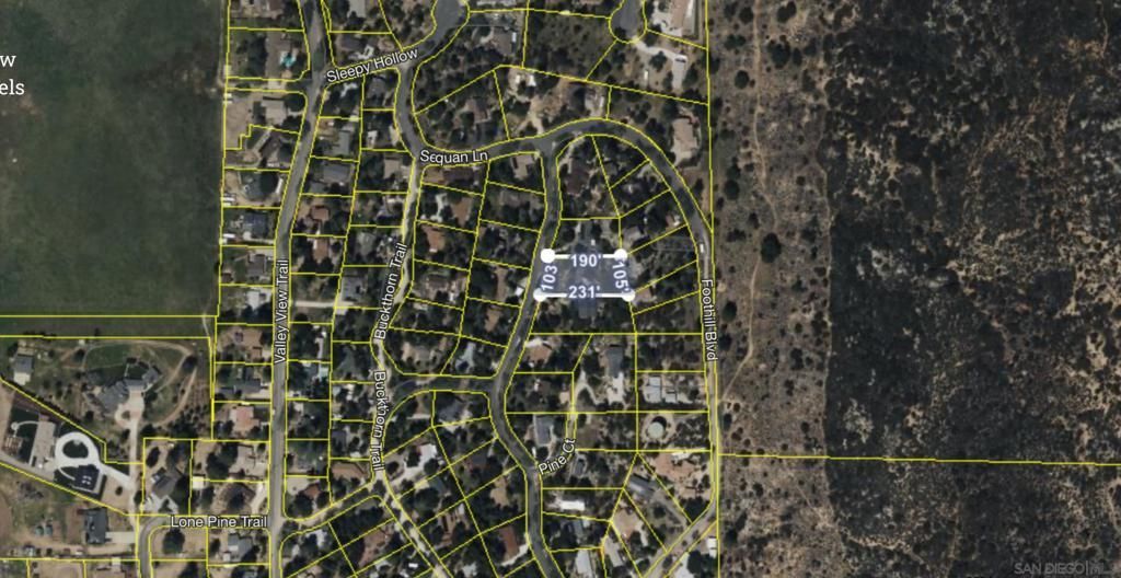 Just under a ½ acre vacant lot in Pine Valley. The lot has large boulders and oak trees on it. It has had a septic layout done for a 1 bedroom home, perc test, and survey. One street away from the Cleveland National Forest, 15 minutes from Mount Laguna, 35 from Julian and Lake Cuyamaca. You are close to some of the best recreation San Diego has to offer. Right from this property you can ride horses, mountain bike and hike into the mountains. This lot has a water meter installed and there is power across the street. Next to 8141 Pine Blvd.
