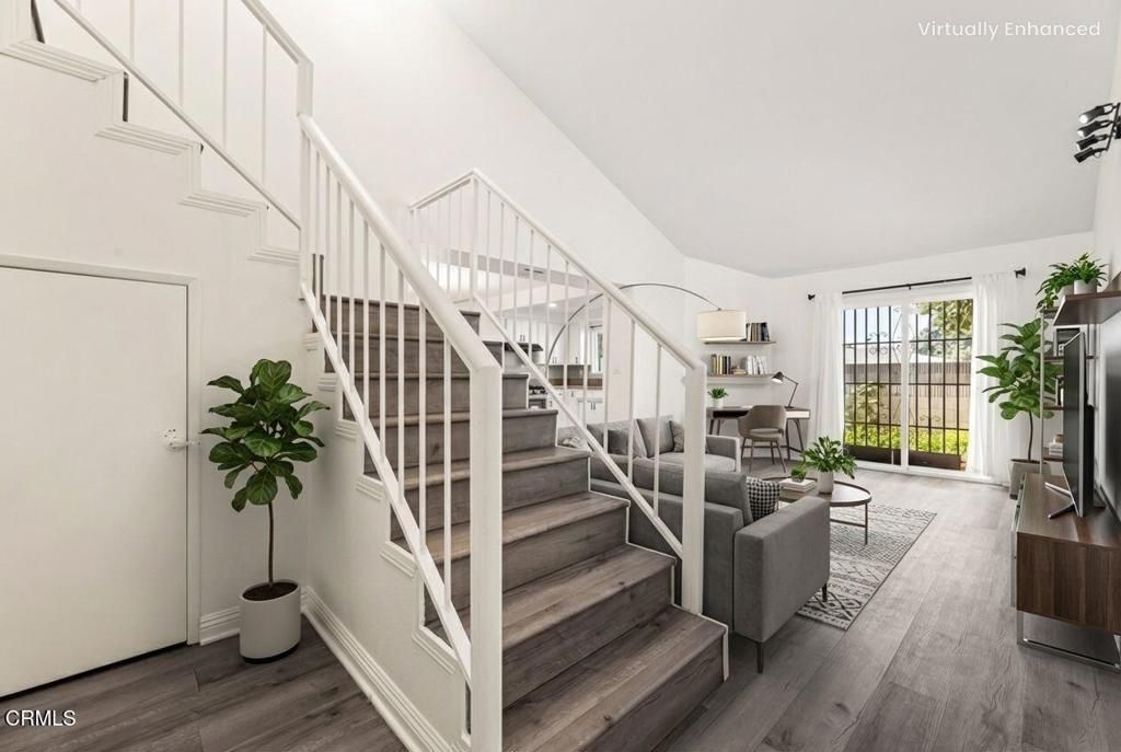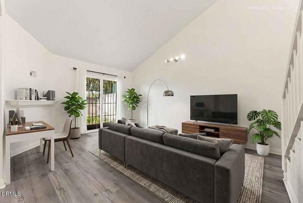 Look no further!! This lovely two-story condo has Vaulted ceiling, 3 bedrooms (Upstairs), 3 bathrooms, 2 balconies, attached 2 car garage, outdoor patio, and newer beautiful floors throughout the entire home. The main level features an open concept living room and dining area. Kitchen is ready for cooking! Main floor also features half bathroom and an outdoor patio perfect for barbecuing. As you enter upstairs you will see three spacious bedrooms and two full bathrooms. One bathroom is in the hallway and the other is in the master bedroom. All bathrooms features newer quartz counter top. Both master bedroom and second bedroom has their own balcony with glass sliding door. Plenty of closets in hallway. Great price for one of the best condo in a peaceful community. Close to shopping and quick easy access to LA. Must see to appreciate. Photos are virtually Staged including backyard landscaping