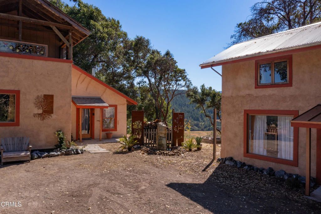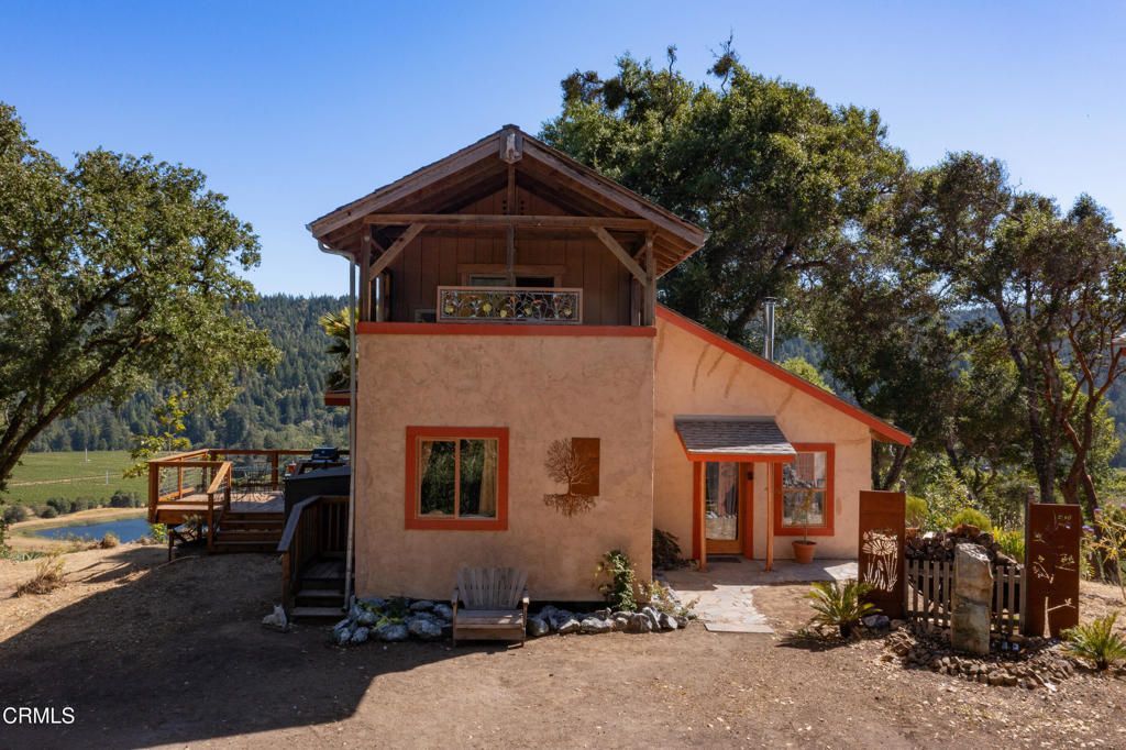 Set atop a hillside in the Heart of Anderson Valley--literally, this Mediterranean-style home with its earthy exterior color offers a vivid contrast to its surrounding foliage and landscape. The main entry gives way to a casual but elegant living room with vaulted ceilings, stained concrete flooring and a wood burning stove. One side of living room opens to the dining and additional living area that flows seamlessly to the outdoor porch. The kitchen and staircase leading to the upper level are also connected to the living room through an ached doorway. In addition, the main level offers a spacious bedroom, a bathroom and a second porch. From nearly every window, you'll see layered gardens and distant valley and hillside views. The upstairs ensuite includes a bedroom, a bathroom with soaking tub framed by windows offering stunning views of the valley below, an office, and an outdoor open room. This home embodies the indoor-outdoor lifestyle.Set apart from the main house is a detached two-story casita. The ground level is a flexible open space--ideal for guests, a creative studio, or a peaceful retreat. Above, is a private studio apartment with an internal and an external access.Only minutes from downtown Boonville, yet worlds away in feel, this exceptional wine country retreat is a rare opportunity to live in a space that is both cultivated and wild.