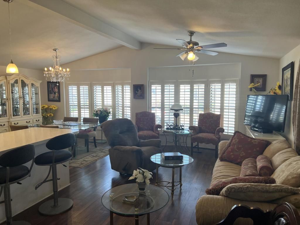 MOVE IN READY, YOU OWN THE LAND!! This well-maintained home features three spacious bedrooms and two full bathrooms, cathedral ceilings, and attractive wood laminate flooring throughout. The generously sized primary bedroom includes a walk-in closet and a private en-suite bath. The additional bedrooms are also roomy and versatile.The open-concept living and dining areas are filled with natural light and enhanced by new plantation shutters, creating a bright and welcoming atmosphere. Step outside to the covered front porch, perfect for relaxing or entertaining, which leads to a charming garden area complete with a fire pit--ideal for outdoor gatherings. The property is newly fenced, landscaped for easy maintenance, and includes a storage shed for added convenience.Ideally located just steps from the resort-style amenities of the exclusive 55+ community of Vista Montana, this home offers exceptional value, comfort, and convenience. An easy and short drive to Palm Springs further enhances its appeal. Residents enjoy beautifully maintained grounds with pools, a dog park, and a stunning clubhouse offering a variety of activities and social events.Do not miss this incredible and affordable opportunity--your perfect home awaits.
