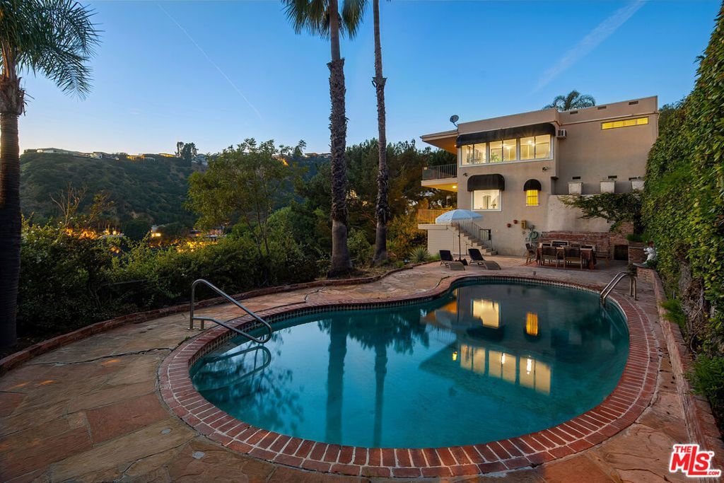 Perched on a quiet cul-de-sac above the Sunset Strip, this striking mid-century estate captures sweeping panoramic city views stretching across Century City and beyond. The residence offers a rare blend of privacy, character, and iconic Los Angeles vistas. The home is anchored by a dramatic living room featuring a stately double-sided stainless steel fireplace, an architectural centerpiece that reflects the era's bold, modernist sensibility. Parquet wood floors add warmth and character, while walls of glass frame the skyline and invite natural light throughout. Designed for quintessential indoor-outdoor living, the expansive yard features a swimmer's kidney pool set against a backdrop of glittering city lights. The primary suite is ideally positioned to take in jetliner west-facing views, delivering striking sunsets and a true sense of elevation above the city. A compelling opportunity to preserve and enhance a classic mid-century property or reimagine it into a modern architectural statement, this offering combines location, views, and design pedigree in one of the Hollywood Hills' most coveted settings.