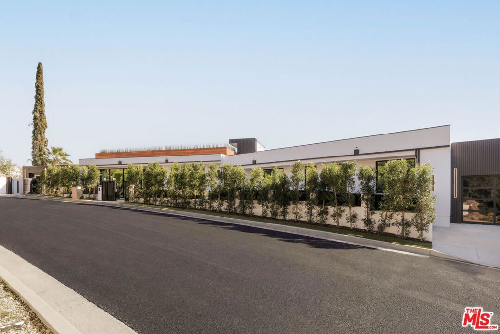 Welcome to a truly exceptional estate in the prestigious Royal Oaks enclave of Encino, where elevated design, breathtaking views, and modern luxury come together seamlessly. Meticulously curated materials and finishes are showcased throughout this five bedroom plus an office, nine bathroom residence. Upon entry, soaring ceilings, expansive walls of glass, and a light-filled open layout create a seamless connection to the surrounding landscape. A striking titanium gold staircase with an integrated water feature serves as a sculptural centerpiece, setting the tone for the level of design and detail carried throughout. The formal dining room is complemented by a temperature-controlled wine cellar, while a nearby powder room is finished in Brazilian green marble, adding a refined touch. The culinary experience is elevated through a dual-kitchen concept. The main kitchen showcases a fluted natural stone island and white onyx countertops paired with custom German cabinetry, finished with aluminum and leather accents. A secondary kitchen provides additional functionality, ideal for both everyday living and entertaining. The primary suite serves as a private sanctuary, capturing stunning views and offering a spa-inspired bathroom with bookmatched stone. Designed for both wellness and entertainment, the home features an indoor sports court ideal for racquetball or basketball, a game room, and a fully equipped fitness area with a red light sauna and cold plunge. A private theater and expansive entertainment level with a custom bar finished in agate blue stone create the perfect setting for hosting, seamlessly opening to outdoor living spaces. The outdoor setting features an infinity edge pool, and a rooftop deck, all designed to enhance the overall sense of luxury and relaxation. This new construction estate offers a rare combination of scale, design, and lifestyle in one of Encino's most sought-after neighborhoods.Additional features include a five car garage with high ceilings, elevator, and Control4 smart home automation system.This is a rare opportunity to own a statement property where design, views, and lifestyle converge at the highest level.