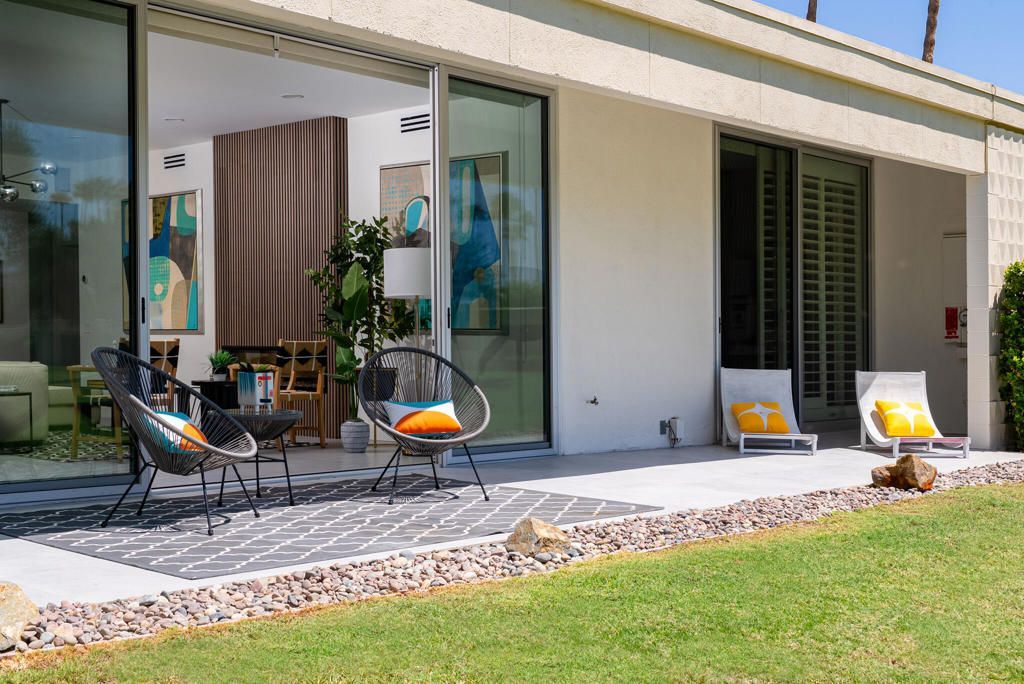 Discover a rare opportunity to own a piece of Palm Springs history with this 2-bedroom, 2-bath home, originally designed in 1967 by renowned architect Richard E. Harrison and redesigned in 2025. Among the first residences built in the iconic Seven Lakes Golf & Country Club, this home combines timeless mid-century modern architecture with thoughtful contemporary updates--all in a serene cul-de-sac setting overlooking the second fairway of the Ted Robinson-designed executive golf course. Inside, you'll find a light-filled, open layout designed to blur the lines between indoor and outdoor living. The updated kitchen and bathrooms feature sleek finishes, custom cabinetry, and premium appliances, while walls of glass invite natural light and frame striking mountain and golf course views. With a modern living room fireplace, an upgraded electrical panel, owned solar system and double paned sliding doors/windows, this residence offers eco-conscious upgrades that lower your carbon footprint while elevating the home's comfort and style. The versatile second bedroom can easily serve as a guest suite, home office, or private retreat. Large sliding doors showcase the tranquil courtyard and mountain backdrop, creating a relaxing escape within your own home. Behind the guarded gates of Seven Lakes, residents enjoy access to an array of amenities including a private clubhouse with restaurant and bar, 15 heated pools and spas, tennis and pickleball courts, and the signature Ted Robinson golf course. An assigned carport adds convenience with parking and extra storage. This home embodies the Palm Springs lifestyle--architectural pedigree, modern upgrades, sustainability, and resort-style living in one of the desert's most sought-after communities.