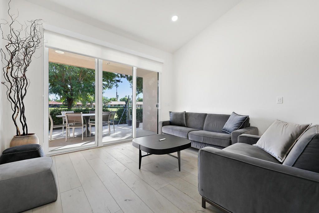 Step into style and comfort in this beautifully updated home, where every detail has been thoughtfully curated. The fully remodeled kitchen features white quartz countertops, sleek soft-close cabinetry, and high-end finishes. Both bathrooms offer floating vanities with quartz tops, modern fixtures, and elegant ceramic tile in the primary suite's spa-like shower.Enjoy engineered wood flooring throughout, custom roll-up window treatments, blackout shade in the primary bedroom, recessed dimmable lighting, and new doors for a fresh, modern feel. Slate tile enhances both the front courtyard and rear patio for low-maintenance outdoor living. Vaulted ceilings and abundant natural light frame stunning mountain views in front and sweeping golf course vistas from the back patio.Sunrise Country Club offers guard-gated living with 746 condos, an 18-hole executive golf course, 21 pools, 19 spas, 9 tennis courts, active Pickleball and Bocce clubs, and a newly renovated fitness center, clubhouse, and dining room. The stylish Mixx Lounge is perfect for brunch or dinner. Located in Rancho Mirage, close to shopping, entertainment, and medical facilities, with Palm Springs International Airport just 20 minutes away.