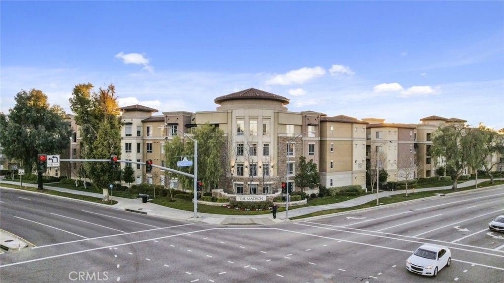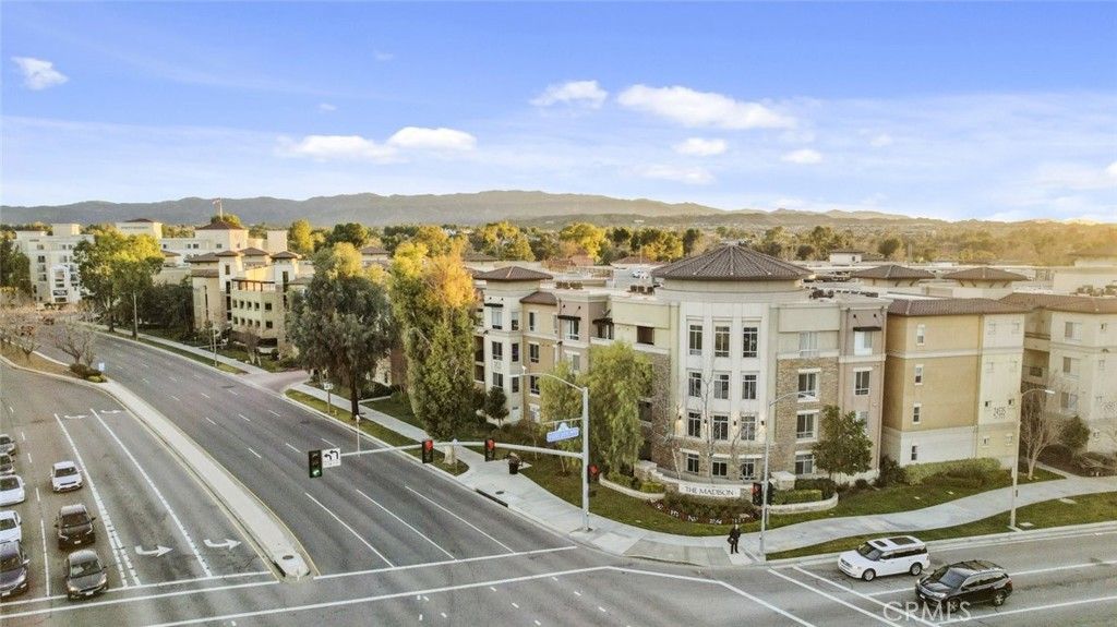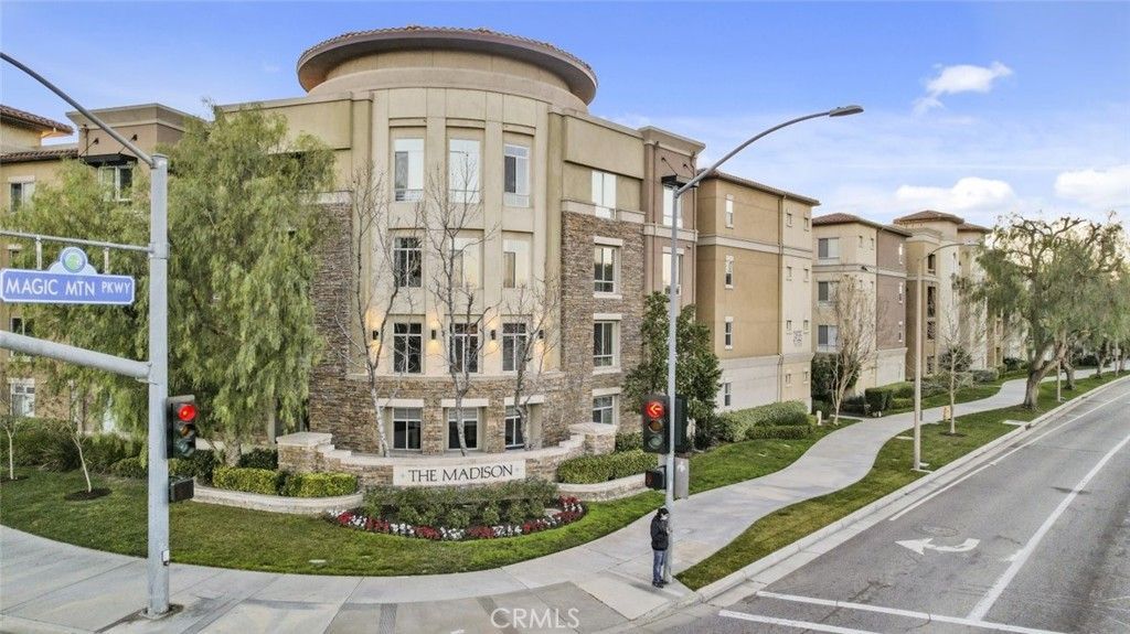 An exquisite and fully furnished condo with in-unit laundry, right across from major shopping centers and a variety of entertainment, residing within the prestigious Madison of Santa Clarita! Completely illuminated by both large windows and recessed lighting throughout, find a 1,090-sqft floorplan detailed with beautiful laminate and stone flooring, tons of built-in storage space, and a fabulous private balcony enjoying scenic views of the courtyard below. The lovely open concept allows for seamless entertaining between the dining and living spaces, and even includes a built-in office nook with shelving and extra lighting. Sparkling stone countertops and well-crafter shaker cabinets adorn this user-friendly kitchen equipped with built-in stainless-steel appliances while also including a comfortable breakfast bar with two pendant lights overhead. Both bedrooms are calming spaces featuring built-in closets with one bedroom including a dual entry bathroom. The large primary bedroom enjoys the exclusive benefit of separate access out to the balcony plus an en-suite bathroom fitted with a corner double sink vanity. The perfect place to call home with this sought-after community offering of a beautiful courtyard, fitness center/gym, lounge areas, recreation space, dining areas, shaded outdoor picnic areas, and the glittering waters of the sun washed pool plus spa provided to all residents. Right in the heart of beautiful Santa Clarita and nearby the Valencia Westfield Mall, a variety of shops, restaurants, entertainment, markets, plus city transportation, and easy access to the 5 freeway!