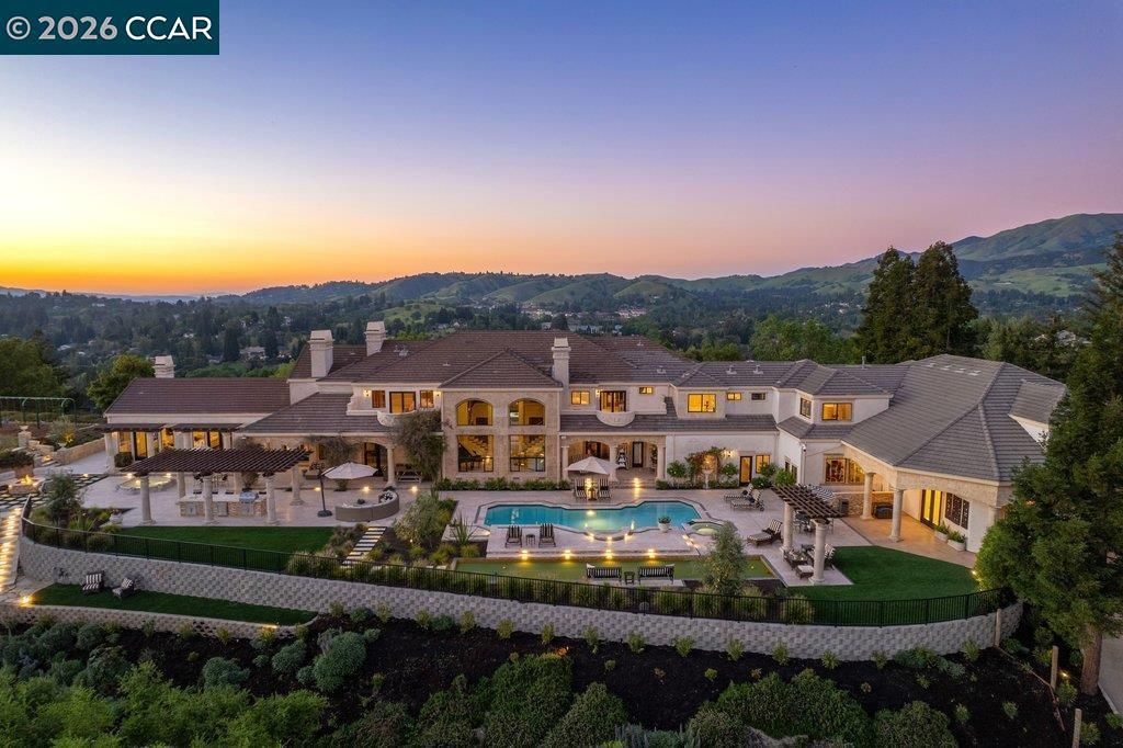 A secluded drive ascends to the hilltop gated estate, Bella Vista de Valle, a Mediterranean masterpiece defined by effortless living, exceptional lifestyle, and quiet luxury. Sweeping 360-degree views, highlighted by Mount Diablo, are perfectly positioned as though the landscape were a work of art framed exclusively for this remarkable residence. A grand foyer impresses with soaring 19-foot ceilings, stately columns, and picturesque windows that frame breathtaking valley vistas. Set on approximately 5.31 acres and spanning 13,410± square feet, the estate offers 7 bedrooms, 7 full baths, and two half baths, along with expansive living spaces and a newly renovated gourmet kitchen. Dual Calcutta Supreme islands anchor the space beneath designer chandeliers, complemented by custom fluted-glass cabinetry, ambient lighting, and a full suite of professional-grade appliances with an adjacent hidden pantry that reveals itself like a well-kept secret. Exceptional amenities include an INDOOR BASKETBALL court, au pair suite, exercise room, billiard/bonus room, richly detailed office, & more. The resort-style grounds showcase a spectacular pool, spa, fire pit, bocci court, putting & chipping greens, a soccer field, a childrens playground, an outdoor kitchen, & multiple covered loggias.