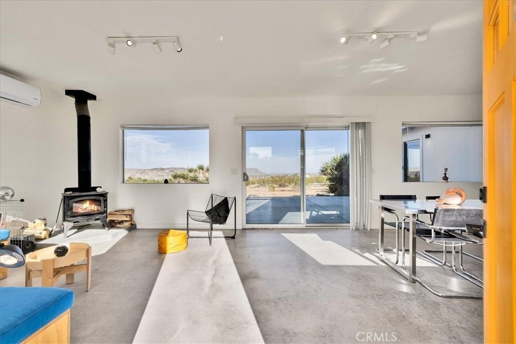 Set on 2.5 acres in the heart of Landers, this fully rebuilt and thoughtfully expanded 2-bedroom, 2-bath home offers striking, unobstructed views of Goat Mountain right from the center of the property. Nearly everything is brand new, blending modern efficiency with artistic character. Inside, the bathrooms are a true highlight, featuring a deep soaking tub perfectly positioned beneath a window and finished with vibrant, colorful grout that adds a unique designer touch. The living room is anchored by a cozy wood stove and a custom-designed sofa with integrated storage (removable if desired), while energy-efficient mini splits provide year-round comfort in both hot desert summers and cool winter nights. A dedicated laundry area adds everyday convenience. Outdoors, two patios create ideal spaces for relaxing or entertaining under the wide-open desert sky, highlighted by a mature Joshua tree?a special and increasingly rare feature in this part of Landers. The property also includes two sheds?one well-suited as an art studio or home office?and a vintage Airstream that can be included in the sale, adding extra charm and flexibility. Located just one block from pavement for easy access, and within close proximity to local favorites like the Integratron, Gublers Orchids, and La Copine, this home is also just 25 minutes to Joshua Tree National Park and 20 minutes to Pappy & Harriets, making it a perfect full-time residence, weekend escape, or investment opportunity.