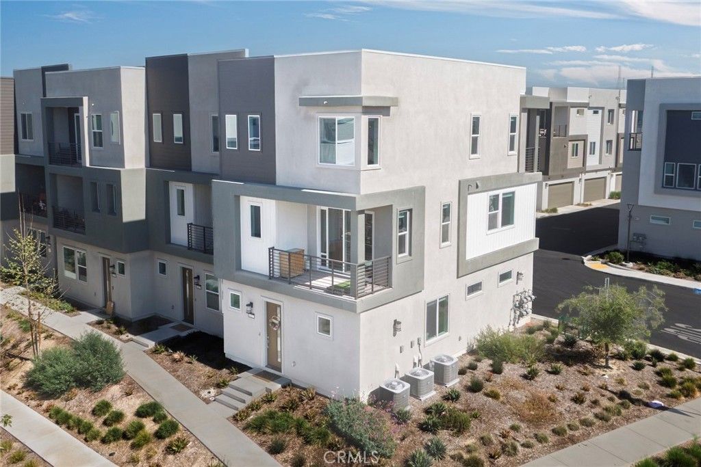Beautiful end-unit, 3-story condo offering modern design, abundant natural light, and mountain views. The entry level features a private bedroom and full bathroom ? ideal for guests, a home office, or multi-generational living ? along with direct access to the attached garage. The main living level showcases a spacious open-concept great room with a large balcony overlooking the mountains, perfect for relaxing or entertaining. A generous family room and dining area flow seamlessly into the upgraded kitchen, complete with a large eat-at island, quartz countertops, soft-close cabinetry, and stainless steel appliances. A light-filled powder room is thoughtfully positioned on this level for added convenience. The third floor offers three additional well-sized bedrooms, including a spacious primary suite with an en-suite bathroom. Luxury vinyl flooring runs throughout the main living areas, adding both style and durability. Built just two years ago, this home feels fresh, clean, and move-in ready. Located in a beautifully maintained community featuring a large clubhouse, two pools, and a play area ? offering both comfort and lifestyle. Solar is leased and saves your SCE bill.