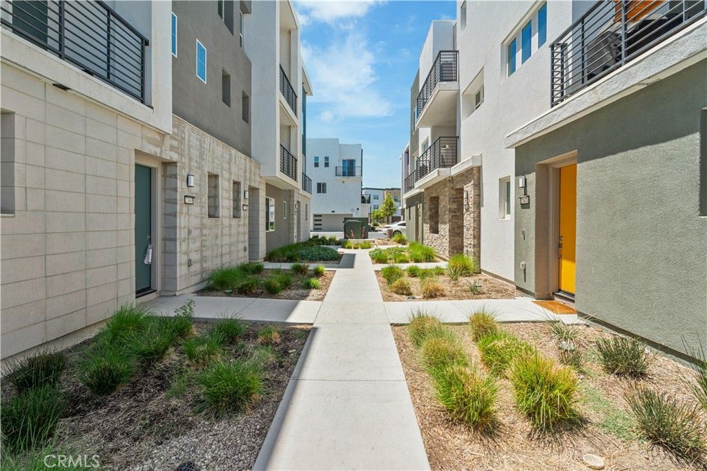 Experience elevated living in this stunning 3-bedroom, 4-bath townhome, ideally situated in the vibrant Five Points neighborhood's coveted Tulip tract. This home, built with premium builder upgrades has soaring ceilings, contemporary finishes, and an abundance of oversized windows that bathe the interior in natural light. The main living area boasts elegant, light-toned wide plank flooring, while plush Berber carpeting adds comfort to the bedrooms. The heart of the home is the chef's kitchen, featuring exquisite granite countertops, white shaker cabinetry, stainless steel appliances, and a generously sized island with ample bar seating, seamlessly connecting to the spacious living room with an oversized balcony, perfect for outdoor relaxation. Each bedroom offers a private en-suite bath and ample closet space, plus a convenient main-level powder room. The luxurious primary suite includes a large walk-in closet, a spacious en-suite bath with a walk-in shower and dual vanity, and a second oversized balcony. An upper-level laundry room adds to the home's convenience. A versatile lower-level bedroom with its own bath is perfect for a home office or guest suite. This smart home features solar panels, a tankless water heater, instant hot water, a smart water valve with leak detection, a smart stove, and an attached 2-car garage. The community HOA provides access to multiple pools with kiddie pool, spa, recreation center, community garden, and several parks. Enjoy proximity to award-winning schools, shopping, Magic Mountain, and easy freeway access.