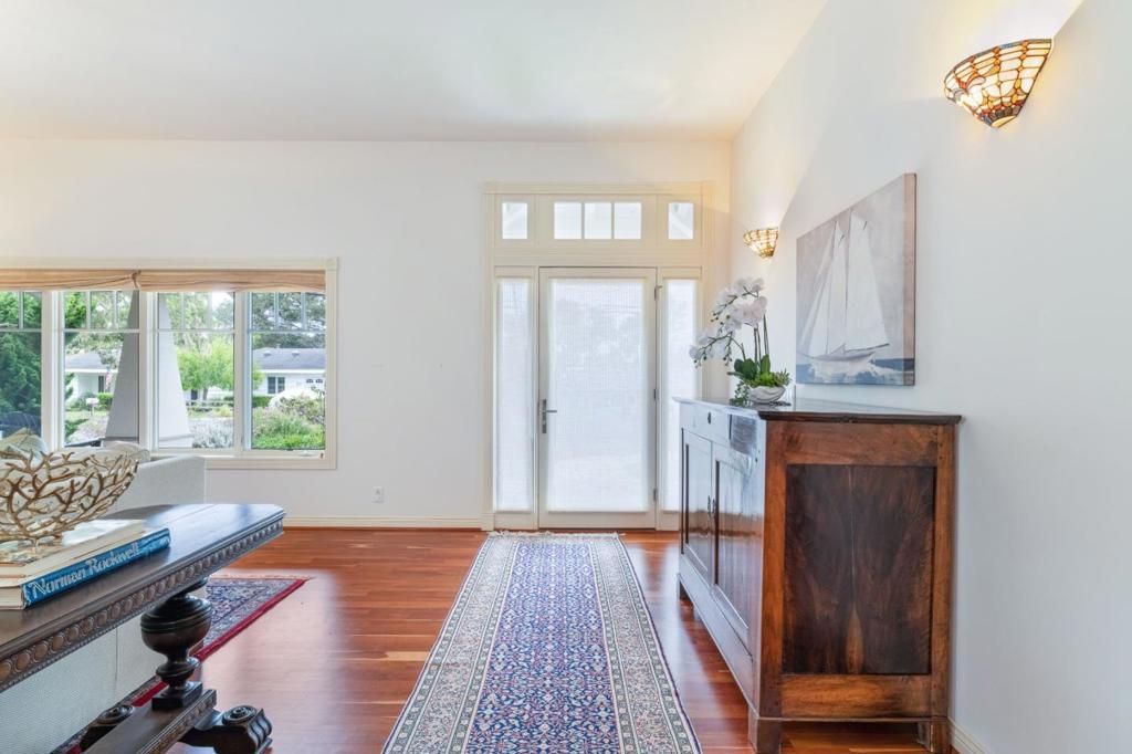 Nestled on one of the quietest streets in Pebble Beach and just a short golf cart ride from the renowned Monterey Peninsula Country Club, this beautifully crafted home offers the rare advantage of newer construction in a timeless coastal setting. Featuring 4 bedrooms, 2 full bathrooms and 1 half bath, the layout is thoughtfully designed for both comfort and entertaining. A spacious great room anchors the home, showcasing rich hardwood floors, abundant natural light, and a well-appointed kitchen ideal for gathering with family and friends. An inviting wraparound porch provides the perfect setting for morning coffee or evening sunsets, while the private backyard and patio offer a peaceful retreat for relaxation or outdoor entertaining. Large windows throughout the home fill the interior with natural light, enhancing the warm and welcoming atmosphere. Upstairs, the primary suite enjoys beautiful ocean views, creating a tranquil escape at the end of the day.
