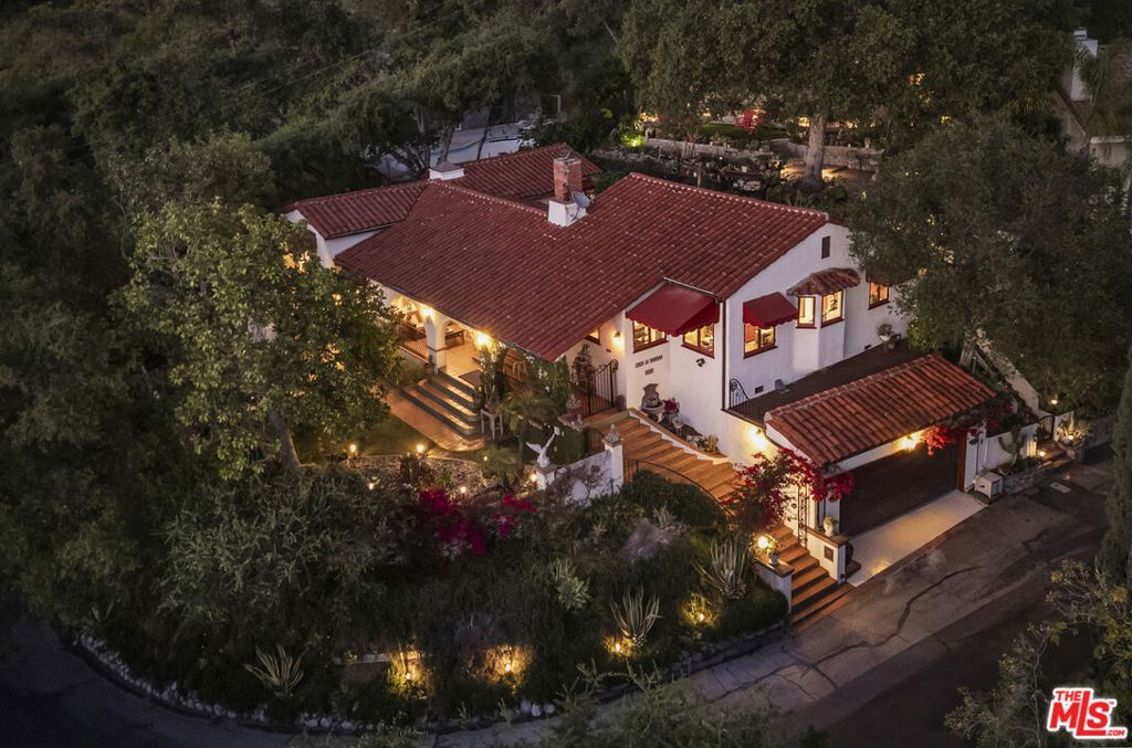 Casa de Manana- Spanish Colonial Revival. Timeless Spanish Colonial Revival residence set on a private canyon lot with sweeping western sunset and city views. Lovingly restored with exceptional attention to detail, blending classic Mediterranean warmth with artisanal craftsmanship. Features include a traditional red clay tile roof, arched entryways, lath-and-plaster walls, handmade tile accents, and beautifully preserved original details throughout. Charming courtyard entry with fountain and magnolia tree leads to a romantic portico and below-ground wine bodega. Interior highlights include tongue-and-groove oak and mahogany floors, stained wood doors, leaded stained-glass windows, original light fixtures and hardware. Elegant living room with gas fireplace adorned with rare Spanish tiles opens via French doors to a serene patio, koi pond, and manicured gardens beneath a century-old oak. Spacious chef's kitchen with canyon views, stone countertops, breakfast bar, rich cabinetry, Wolf range, and breakfast nook flows seamlessly into dining and family areas. Additional upgrades include a new electrical panel, sewer, and all water pipes replaced with copper. Private deck with hot tub and fire pit provide the perfect setting to enjoy unforgettable sunsets. A rare and beautifully preserved architectural offering.