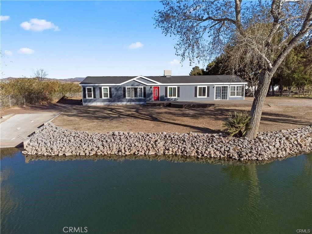 LAKEFRONT HOME IN NEWBERRY SPRINGS ON 2.38 ACRES!! This stunning property is a turnkey lakefront oasis on a permanent foundation at Lake Wainani. The property features a 4-bedroom, 2-bathroom manufactured home on permanent foundation with over 2,280 square feet of modern living space. An open floor plan features high ceilings, a kitchen island for entertaining and updated paint and flooring throughout. A detached garage with a workshop provides the perfect opportunity to store your boat or off-road vehicles. The electric gated access provides security and privacy. The expansive 2.38 acre lot offers ample room for RV parking. Step out of the living room onto an expansive deck that directly faces the lake and includes a boat launch and private dock site. Lake Wainani provides a shared well for residents and the property features a conventional septic system and a roof mount solar power system for energy efficiency. This property offers breathtaking, unobstructed views of the lake and surrounding mountains and desert sunsets right from the deck. You can waterski by day and bbq in the evenings! Trade the city noise for lakefront tranquility, this property has it all!