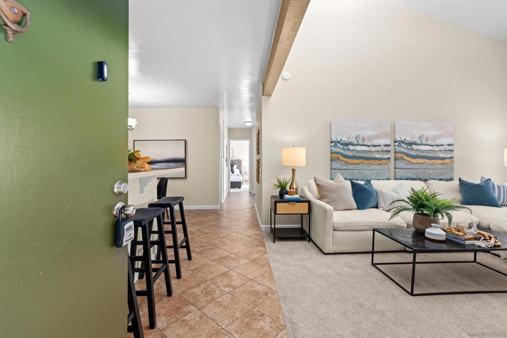 Light, bright & airy! This terrific top floor Serra Mesa condo features vaulted ceilings in the living room, a spacious master bedroom w/ a huge 3 door closet and upgraded shower doors in the master bath. There's also a nice wall AC unit in the living room for those warm Summer days. Upgrades include fresh paint, new carpet, newer 6 panel interior doors & updated light fixtures. There's even 2 assigned parking spots! Please see supplement for more. Welcome home! The complex amenities include a wonderful pool area complete with spa and kiddie pool, a rec room w/ a pool & ping pong table, BBQ area & a large fenced in dog run.