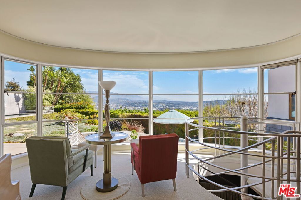 Set above the city with sweeping, panoramic views, this streamline moderne residence offers a rare blend of character, volume, timeless design, and classic Hollywood glamor. Spanning approximately 3,132 square feet, this 4-bedroom, 4-bathroom home is thoughtfully designed to embrace both comfortable daily living and exceptional entertaining. A dramatic living room welcomes you with soaring ceilings, expansive walls for art, and abundant natural light pouring through walls of glass that frame the stunning vistas beyond. A striking spiral staircase adds a sculptural focal point while leading to a private media/screening room complete with wet bar and powder room---an ideal retreat for entertainment and relaxation. The adjacent dining room is perfectly suited for both intimate gatherings and larger-scale entertaining, seamlessly connected to the home's open and airy layout. The kitchen retains its classic charm while offering generous workspace, an adjoining butler's pantry, and convenient access to the main living areas. A dedicated laundry area and additional service spaces enhance everyday functionality. The first floor also features a versatile den/office with bath, ideal for a home workspace, along with a separate guest or maid's bedroom and bath, offering flexibility for a variety of living arrangements. Upstairs, the primary suite serves as a private retreat, complete with its own luxurious bath and direct access to an expansive upper deck perfect for taking in morning light or evening sunsets. A second bedroom, currently configured as an office, also opens to the deck, creating a seamless indoor-outdoor connection. A third bedroom completes the upper level and shares a Jack-and-Jill bath. Outdoor living is equally compelling, featuring a covered patio overlooking a pool and spa, all set against breathtaking views. A step-down seating area with a fountain provides an additional intimate space for relaxation or entertaining, enhancing the home's tranquil and resort-like atmosphere. Throughout, unique streamline moderne architectural elements, curated interiors, and an undeniable sense of personality create a one-of-a-kind living experience. Only the second time on the market, this residence was featured in the L.A. Times Home Section in November 2006---offering a rare opportunity to own a home that combines architectural interest, functional design, and an exceptional setting.
