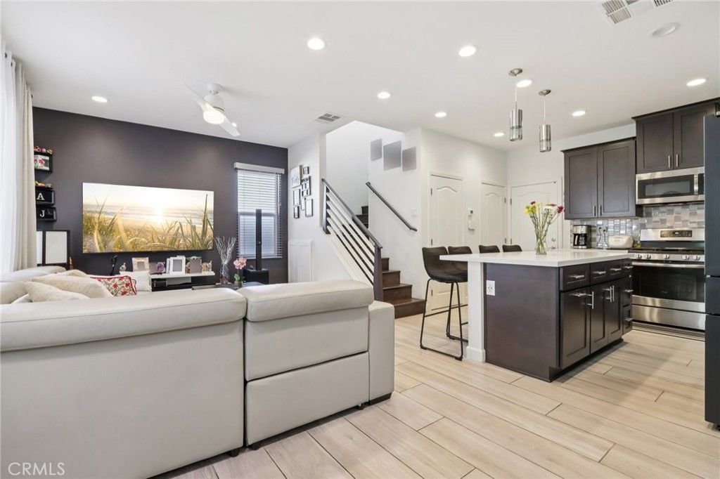 Welcome to this beautifully upgraded smart-home condo offering modern design and comfortable living in beautiful Corona. The open concept floor plan features stylish tile flooring, custom cabinetry, upgraded countertops, water filtration system and elegant wood stairs that create a warm and contemporary feel throughout. The spacious kitchen includes a large center island with seating, stainless steel appliances, and plenty of storage making it perfect for both everyday living and entertaining. Smart home features such as Ring security cameras and MyQ garage system providing added convenience and peace of mind. Upstairs you'll find generously sized bedrooms, two bathrooms, and a convenient upstairs laundry area. Step outside to a private backyard designed for relaxation and entertaining, complete with pavers, artificial turf, and a covered gazebo lounge area. Residents enjoy community amenities including a pool, spa, and picnic areas. Ideally located near shopping, dining, parks, schools, and major freeways including the 91 and 15. This home offers both comfort and convenience in the heart of Corona.