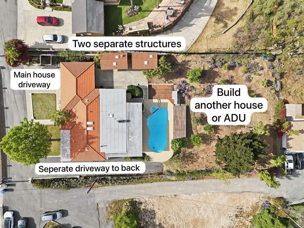 Dont miss this character-filled Spanish-style home featuring 4 bedrooms, 3 bathrooms, and 3 separate living areas, with one next to the pool including a wet bar perfect for hosting. The layout also offers a private bedroom with its own full bathroom convenient for pool/ outdoor access when entertaining. The house offers a rare feature with double garage doors. The main living space opens to a large deck with beautiful views toward Bonita, overlooking the pool and creating a seamless indoor-outdoor living experience. Throughout the property, youll find existing railing and fencing that is hard to come by in large properties saving you significant money. A standout feature is the two separate driveways, including one that leads to additional land with incredible potential. This space is ideal for a custom Spanish home, another ADU, or possible lot split with resale opportunity. The property also includes two detached structures, offering flexible use as office space, storage, or guest accommodations. Recent upgrades include ABS plumbing, a newer roof, fresh paint, and updated interior finishes. Zoned for horses.