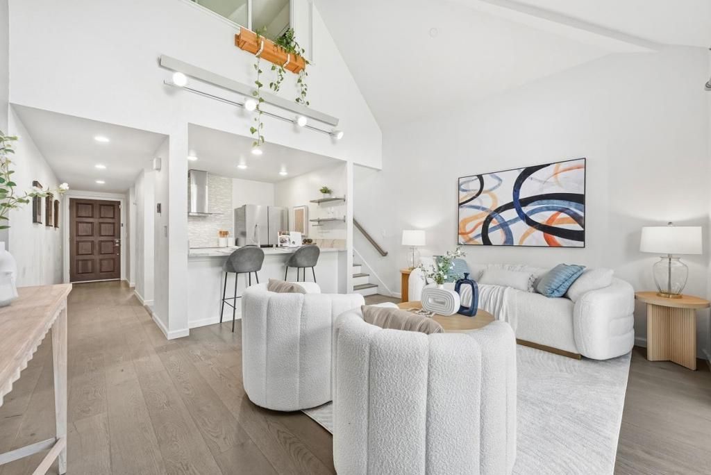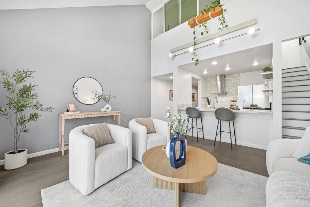 Welcome to this prime end-unit condo with 2 beds and 2 baths in the heart of Palo Alto, set within a gated community. This two-story home offers a thoughtful layout, starting with a spacious lower-level bedroom and a nearby full bath featuring a floating vanity and a sleek stall shower. Down the hall, the cozy kitchen includes quartz countertops, a stylish backsplash, stainless steel appliances, and a breakfast bar. The bright living room boasts a vaulted ceiling and large windows, filling the space with natural light. A sliding door opens to a private balcony-perfect for relaxing outdoors. Upstairs, the primary suite features a bedroom with a vaulted ceiling and an en-suite bath with a shower over tub and skylight, plus direct access to an upper-level balcony. A washer and dryer on the same level add everyday convenience. Additional highlights include engineered hardwood flooring, double-pane windows, and recessed lighting throughout. The home comes with two assigned parking spaces and extra storage in an underground garage. Ideally located near downtown, shops, and restaurants, and within the top-rated Palo Alto school district. Do not miss this great opportunity!