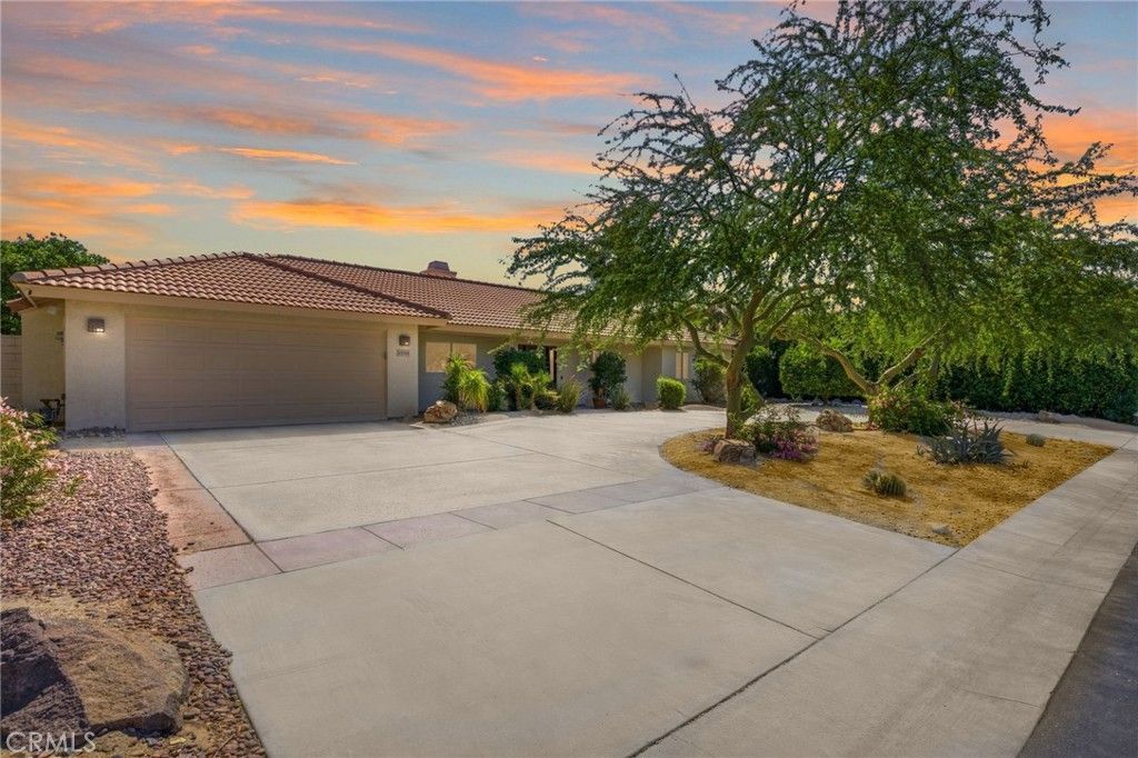 Experience desert living at its finest in this tastefully updated 3-bedroom, 2-bathroom custom home within the prestigious Bermuda Dunes Country Club. The open-concept great room impresses with high ceilings, luxury vinyl flooring, and a signature see-through fireplace. While the remodeled kitchen and private primary suite (featuring a redone bath and patio access) offer interior comfort, the backyard is the true showstopper. A brand-new, modern cool pool deck surrounds the pebble-tec pool and spa, providing a sleek, heat-resistant space for seamless outdoor entertaining. Practical upgrades include a 2019 A/C system and epoxy garage floors. Ideal located across from the greenbelt, which means no neighbors directly across! This home offers 24-hour security and a low HOA that covers premium cable and internet. Incredible value, exceptional floorplan, with premier golf, dining and entertainment all close by. This is one that you will not want to miss!