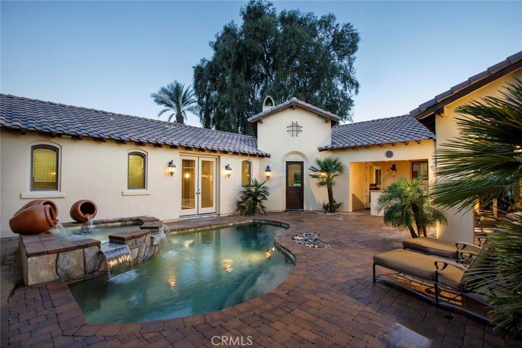 Bermuda Dunes CC ? Castle Harbour. This residence occupies a truly rare position, defined by approximately 309 feet of golf course frontage spanning two fairways and a highly sought after south facing orientation, delivering all-day natural light and warm sun filled rear exposure across the pool, outdoor living areas, and primary interior spaces. Set on a premier corner lot overlooking the par-3, 7th hole of the Classic Course, the home captures an ever changing canvas of multiple fairways, the 7th green, and the Santa Rosa Mountains. The home is intentionally designed so that every primary living space opens to golf course views, creating a seamless connection between interior spaces and the surrounding landscape. Recently refreshed with a curated palette of new interior paint and updated flooring, the home presents a renewed sense of cohesion and sophistication, allowing its architectural scale and setting to take center stage. A hand-forged custom entry door introduces the home with a sense of permanence and craftsmanship, opening to a private courtyard where water, fire, and stone create an atmosphere that feels both composed and personal. The pool and spa, framed by cascading waterfalls, anchor a setting designed for experience and sunlit afternoons, golden-hour gatherings, and the rhythm of desert living. Inside, the architecture reveals itself through volume and light. Walls of glass draw the outdoors inward, dissolving boundaries and framing uninterrupted views, amplified by the homes dual fairway frontage and south-facing orientation. The great room is expansive yet grounded, centered by a statement fireplace and an entertainers bar that becomes a natural point of convergence. The kitchen is conceived as both workspace and social core, equipped with professional-grade appliances and generous surfaces, yet oriented toward connection to the adjacent dining spaces and landscape beyond. The primary suite is set apart as a private retreat, where scale softens into intimacy. A sitting area with fireplace, dual walk-in wardrobes, and a thoughtfully arranged bath create a sequence of spaces that feel both refined and restorative. A separate flex room suited for wellness, dressing, or quiet retreat extends the experience. Guest accommodations are designed with equal intention. Within the main residence, secondary bedrooms offer comfort and discretion, while a detached casita introduces independence, ideal for extended stays or multi-generational living.