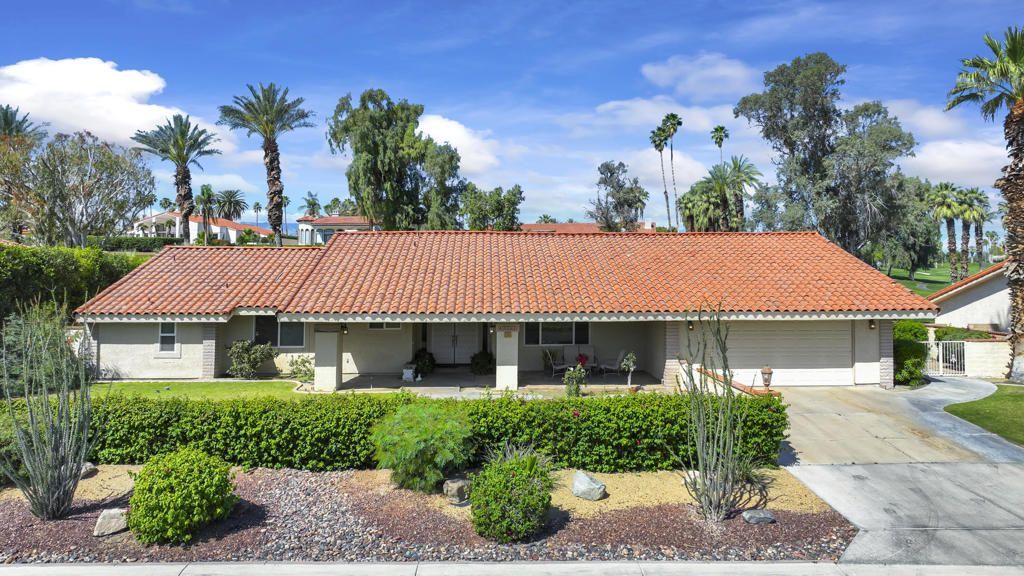 Custom home on a 12,197 square foot lot ON the golf course with mountain views in the exclusive gated community of Bermuda Dunes Country Club. This 2,760 sq.ft. home has three bedrooms, each with their own bathroom. Primary suite with sliders to the pool area is spacious with private bathroom with separate shower and soaking tub, plus French doors to a side patio. There is a formal living room with a fireplace and dining room; the kitchen with slab granite counters is open to a separate family room. The third bedroom, which is adjacent to the family room, has a 3/4 bathroom with a door to the pool area. The sparkling pool/spa has views of the 2nd fairway and mountains with a convenient alumawood patio cover on one side for those who prefer a little shade!! The direct access garage houses a tankless water heater and can accommodate two cars with an area for a golf cart which has access to a side paved area which leads directly onto the golf course. The low HOA of only $214 a month includes cable TV and internet with Spectrum as well as 24-hour guard gated security. IID for lower electric.