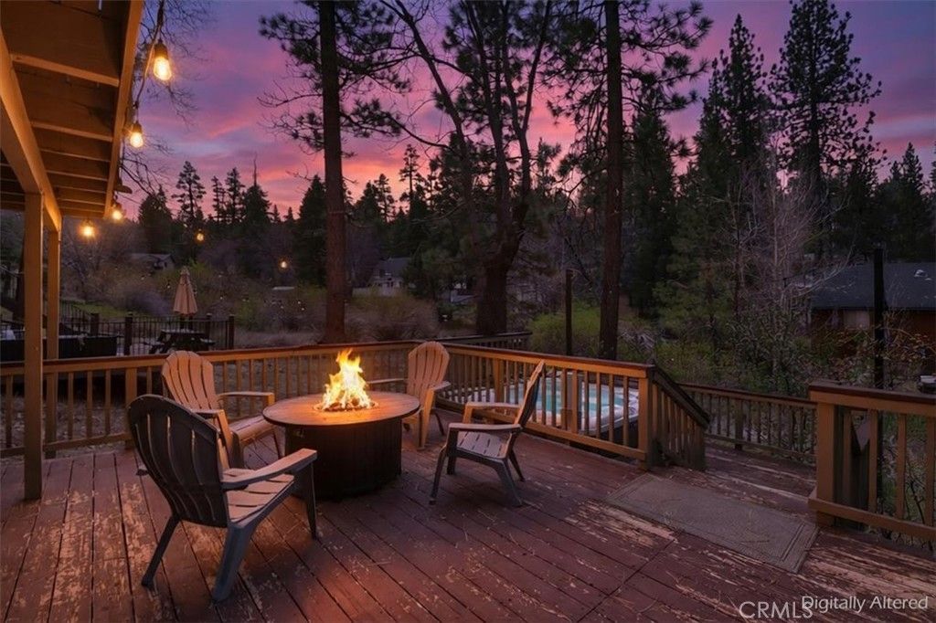This beautifully upgraded 4-bedroom, 2-bath mountain retreat offers the perfect blend of rustic character and modern convenience?all in a prime location just minutes from Bear Mountain Ski Resort, the golf course, and the Big Bear Alpine Zoo. Step inside to an inviting open-concept great room featuring soaring vaulted T&G wood-beamed ceilings, abundant natural light, and a stunning floor-to-ceiling stone fireplace that creates a warm, lodge-style ambiance. Slate tile flooring flows throughout the home, complemented by custom paint and designer wallpaper for a refined mountain aesthetic. The updated kitchen is ideal for entertaining, showcasing rich hickory cabinetry, a center island, stainless steel appliances, and a dedicated dining area?all seamlessly connected to the living space. The flexible floor plan includes two bedrooms and a full bath upstairs, while the lower level features an oversized bedroom with its own fireplace, plus a spacious game room?perfect for guests, kids, or additional recreation space. Both bathrooms have been tastefully upgraded with slate finishes, modern vanities, and updated plumbing and lighting fixtures. Enjoy outdoor living at its best with expansive multi-level decking, complete with a hot tub and fire pit seating area?ideal for relaxing under the stars and taking in the fresh mountain air. Turn-key and move-in ready, this home is packed with upgrades and perfectly positioned for escaping the hustle and bustle, or a short-term rental investment. Dont miss this one.