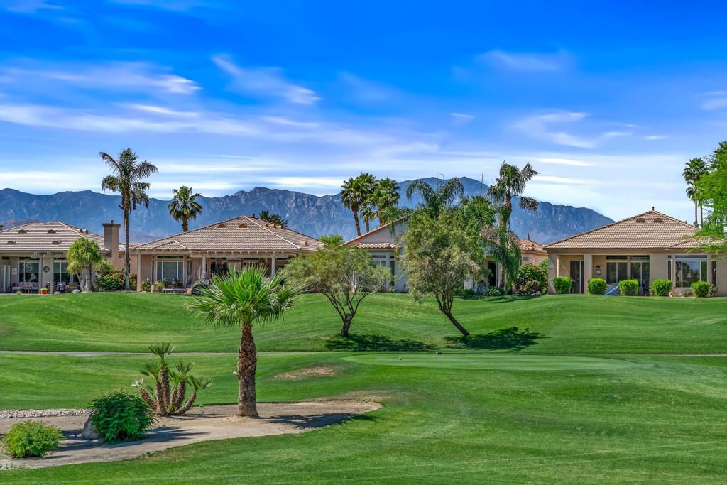Fantastic Mountain, Fairway and Beautiful Sunset Views from this beautiful and popular 2061 sq.ft. home! Featuring 2 BDRMS PLUS a Den, granite slab kitchen counters an open design layout and being offered FURNISHED. The large primary bedroom has dual walk-in closets, dual vanities and custom window replacements. The guest bedroom was customized to the larger version and the dbl door den is being utilized as a 3rd bedroom. All of the fairway/mountain view windows have also been updated/replaced. Additional upgrades include an entry courtyard, both A/C units & the water heater have been replaced, artificial front yard turf,, Toto commodes and an extended aluminum rear patio cover also been added. Heritage Palms is a premier adult community featuring an 18 hole championship golf course, indoor & outdoor pools, pickleball & tennis courts, fitness center, grill room, card rooms, billiards room, social clubs & more.