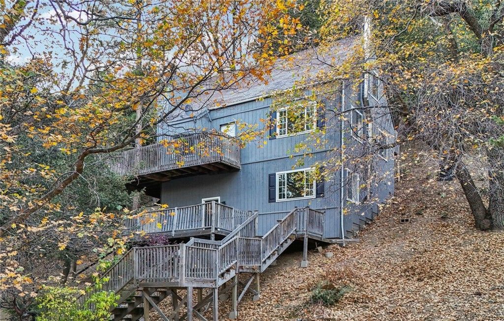 Come experience all four seasons in Angelus Oaks, where golden oaks glow in autumn and a dusting of snow transforms the landscape in winter. Tucked away from the road in a peaceful mountain setting, this beautifully updated three-story home offers the perfect blend of comfort, charm, and scenic serenity. The entry level welcomes you with a cozy family room featuring a wood-burning stove, along with a laundry area and additional storage?ideal for mountain living. Stay warm year-round with both central heat and the inviting wood stove. The main level is the heart of the home, showcasing a spacious living room highlighted by a dramatic A-frame window that fills the space with natural light and captures breathtaking forest views. Gather around the fireplace or step outside to the wraparound deck?perfect for entertaining or simply soaking in the tranquil surroundings. The adjoining dining area and kitchen feature freshly painted cabinetry and a bright, open feel. Two comfortable bedrooms and a tastefully updated full bathroom complete this level. Upstairs, a generous loft-style bedroom with a closet offers a unique retreat. Enjoy your morning coffee or unwind in the evening on your private third-floor deck overlooking the forest canopy. Recent upgrades include a striking black front door and fresh interior and exterior paint, adding to the homes modern mountain appeal. Located just 20 minutes from Redlands, this inviting escape offers fresh air, peaceful living, and unforgettable, star-filled nights.