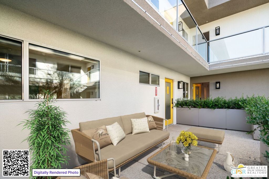 Unit 103 at Querencia Palms presents a standout opportunity within this newly released boutique community in South Palm Springs. Fully renovated and offering fee simple ownership in an intimate 14-unit setting, this residence delivers modern design, flexibility, and exceptional indoor-outdoor living. The open-concept layout features terrazzo-inspired tile flooring, new carpet, and vibrant mid-century finishes, while the kitchen is equipped with WiFi-enabled stainless steel appliances, a gas range, and an air fryer oven. A built-in bar area adds versatility for entertaining, workspace, or additional storage. Two private patios extend the living experience outdoors, including one of the more expansive front patios and a tranquil rear patio with a private koi pond and storage closet. Set within a resort-style environment with a beach-entry pool, spa, fire pits, and gated access - all just minutes from Downtown Palm Springs! This is a rare chance to secure a move-in-ready residence in a limited inventory community.