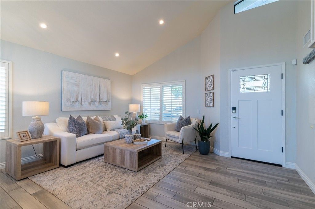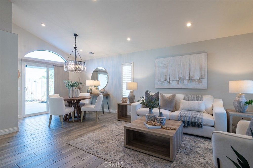 Welcome to this beautifully upgraded 4-bedroom, 3-bath home in the heart of Rancho Santa Margarita. The living room and dining room feature a vaulted ceiling, recessed lighting, plantation shutters, and a stunning chandelier, creating an inviting space for both everyday living and entertaining. Wood-look tile flooring flows throughout the main level. The updated kitchen offers white mission-style cabinetry, beautiful countertops, a farmhouse sink, and stainless steel appliances including a 5-burner KitchenAid range and Bosch dishwasher. It opens to the inviting family room with a fireplace, ceiling fan, and recessed lighting. The downstairs bath has been tastefully upgraded with matching mission-style cabinetry and finishes. Upstairs, the spacious primary suite features a vaulted ceiling, ceiling fan, and a bright, open feel, along with a beautifully upgraded primary bath showcasing a dual vanity, glass-enclosed shower, and a walk-in closet. The upper level also includes three additional bedrooms and an upgraded guest bath, offering comfortable space and flexibility for family, guests, or a home office. Enjoy the private backyard and side yard featuring an Alumawood patio cover with a ceiling fan and lighting, a storage shed, and beautifully landscaped grounds with vibrant color. Additional highlights include dual-pane vinyl windows and sliding doors, a newer water heater and FAU/AC system, PEX repiping, an alarm system, synthetic turf in the front yard for easy maintenance, and a 2-car attached garage with built-in cabinets and a dedicated laundry area. Residents enjoy Rancho Santa Margaritas exceptional amenities, including pools, tennis courts, the Beach Club lagoon, scenic lake, parks, and year-round community events.