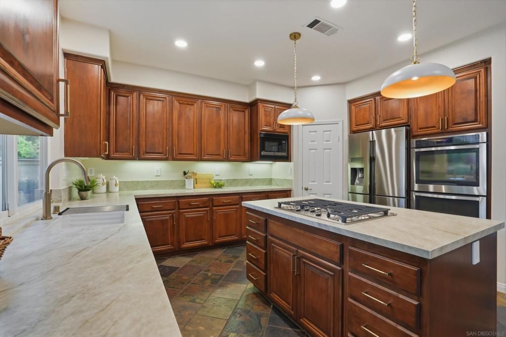 Welcome to the highly sought-after Rancho Carrillo community of Carlsbad. This spacious 4-bedroom home plus a large office offers over 3,100 square feet of comfortable living with 3 full bathrooms and a thoughtfully designed floor plan ideal for both everyday living and entertaining.The light-filled interior features a generous family room with a cozy fireplace, overhead lighting throughout, and ceiling fans in every bedroom and the family room. The kitchen has been refreshed and includes newer stainless steel appliances?oven, dishwasher, microwave, and refrigerator?while offering an opportunity to customize finishes to your personal style. Fresh paint and carpet provide a clean, move-in ready feel. Upstairs, the expansive primary suite is a true retreat, complete with a private sitting room and a deck to enjoy peaceful mornings or unwind in the evening. Additional bedrooms are well-sized, and the versatile office space is perfect for working from home, a playroom, or guest overflow.The 2-car garage has been upgraded with epoxy flooring and enhanced lighting, previously used as a home gym. Outside, enjoy a drought-tolerant yard, newly added front hardscaping with widened driveway and steps, and a refurbished back deck for outdoor living.Located in a quiet, well-maintained neighborhood with access to a community pool/spa, this home is just one block from a scenic trailhead and within walking distance to a top-rated California Distinguished elementary school. Close to shopping, dining, and all that North County has to offer, this home combines space ,location and convenience.