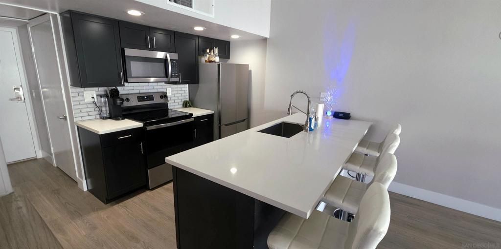 JUST LISTED ? MODERN MISSION VALLEY LIVING, step into style, comfort, and convenience in this fully remodeled, turnkey condo in the heart of Mission Valley. This stunning top-floor unit was completely renovated in 2024, featuring a redesigned kitchen with brand-new appliances, modern finishes, and a clean, contemporary feel throughout. The open layout and soaring cathedral ceilings create an airy, light-filled space that feels both spacious and inviting.