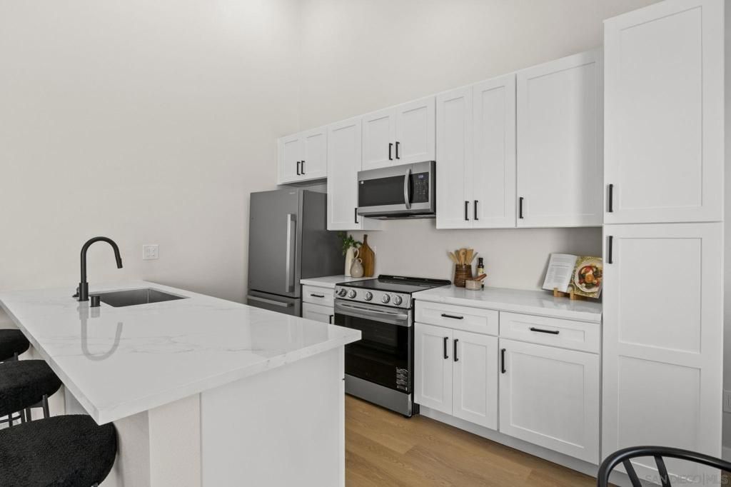 VA Approved! Beautifully remodeled upper-unit condo in the heart of University City with no neighbors above and vast vaulted ceilings throughout. This stylish, move-in ready home showcases a brand-new kitchen with white shaker cabinetry, quartz countertops, new appliances, and a modern backsplash. Thoughtful upgrades include new windows, a new sliding door, and new lighting and fixtures throughout. The bathroom has been fully refreshed with a new vanity, quartz counters, and a custom tile shower. The spacious bedroom is complemented by multiple closets for exceptional storage. Garage parking adds convenience, and the central location puts you just minutes from shopping, restaurants, major freeways, and all that University City has to offer. Enjoy the pool and of being next to restaurants and shopping.