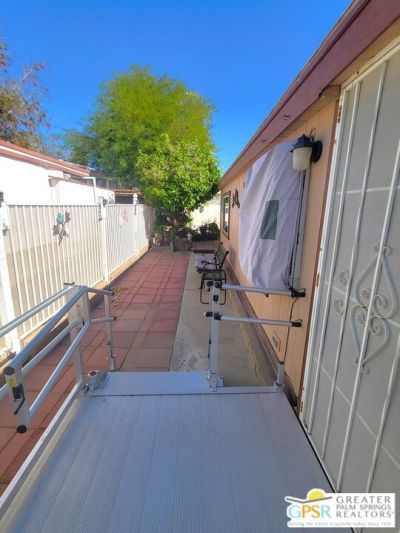 Hidden away behind a screen of fruit and palm trees that has great curb appeal is a gorgeous 3 Bedroom / 2 Bath, 1296 SF home built in 1980, located in the active 55+ Community of Desert Crest Country Club. Set in the West part of the Community and secure behind white metal gates including the fully automated Carport Gate, it is set up for wheelchair ramp access to the Front Entry Door. The North side of the Home has space for a shaded seating area. Steel Security Screen Doors are installed on both entries, allowing a flow of breeze. Newer windows with plantation shutters regulate the light, while a newer HV/AC and Evaporative Cooler regulate the temperature. Inside is a Living Room with a Media Center area, with open access to the Dining Area. Luxurious tile floors run throughout the public spaces, and rich wood styled walls bring a warmth to the interior. The Dining Area has a classic chandelier in place, and you find ceiling fans installed throughout the Home. A built-in Windowed Hutch brings natural light into the Dining space. The galley style Kitchen has been completely upgraded with new appliances that include a banquet doored Refrigerator, massive 5 burner built-in gas Range and Hood, and a Dishwasher to die for. The large double sink will handle any large cooking plans. A neat Breakfast Bar is around the corner as well as a doored Pantry area. A large Hall space with ceiling fan is the central access to the two Bedrooms & Baths. The larger Bedroom is ensuite and includes a walk-in Closet and enlarged Shower. Other Bedrooms are spacious; one has been used as a TV Room. The Bedrooms are warm with luscious laminate wood flooring, which complements the walls. You have everything you need in this private feeling Home, and there are some furnishings already included for you. Outside, the low-maintenance landscaping that surrounds the rear fully covered Patio which is completely fenced for privacy, ensures that upkeep remains effortless, allowing residents to focus on the joys of community living. The rear wall with its decor and plantings is a great spot to enjoy your serenity. Located just down the road from the huge Clubhouse, natural hot mineral spring water pool & multiple spas, and golf facilities that are free to the Owners, this home enjoys the perks of a lively lifestyle, surrounded by the scenic beauty of the desert landscape in the Western Coachella Valley. the gated Carport has room for two vehicles, and extra space for a Golf Cart. The interior of the Home can be directly accessed from here. The Desert Crest Country Club community boasts a 9-hole golf course, inviting residents to enjoy leisurely rounds amid the picturesque setting of pond and mature trees that boast views of Mounts San Jacinto and San Gorgonio and the iconic windmills of the Banning Pass. This oasis extends beyond the golf course, offering a multitude of amenities enhancing your daily life. Residents here enjoy a multi-faceted Clubhouse featuring a healthy mineral