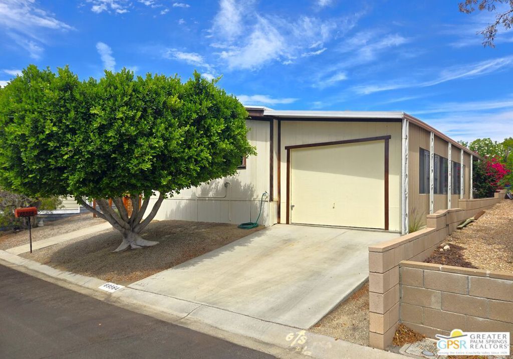 Experience the ultimate 55+ lifestyle in this beautifully renovated, fully-furnished retreat. Situated on a quiet cul-de-sac within the serene Desert Crest Country Club, this 1,240 SF, 2 Bedroom and 2 Bath residence offers a rare blend of modern comfort and active community living. Best of all? You own the land (Fee Simple), ensuring long-term stability and value. Upon arrival, you'll notice the practicality of the home's exterior, designed not only for curb appeal but also for convenience. With the Southeast-facing covered patio, you have the tranquil outdoor space that is perfect for enjoying the sunshine while surrounded by palm tree decorated screening. Through the front door, you'll enter the Sunroom that is comfortably carpeted, and then accessing another door you enter the immense Living Room that has an attached Dining Area. Heavily remodeled, the newer laminate wood flooring and tile offers fresh and elegant aesthetics that flow all the way throughout the interior, while a central divider wall gives you multiple seating in the Living Room and a designer Kitchen armoire. The Kitchen has exactly what you need to entertain friends and family. The thoughtfully designed layout features expansive laminate countertops, a newer modern composite sink, a sleek Kenmore gas range, a stainless-steel Kenmore dishwasher and LG refrigerator, all designed to make meal preparation enjoyable rather than a mere necessity. The seamless transition between spaces allows for effortless entertaining and relaxation, while the more privatized Bedrooms provide warm and inviting retreats that ensure restful nights in a cozy atmosphere. Before you arrive there, you find the separate Laundry Room with a matching set of LG Washer & Dryer, and direct Garage access from the interior of the home. The one vehicle Garage provides ample oversized space for parking your vehicle, and has plenty of storage capability as well. Along the hall, the Master Bedroom serves as your personal sanctuary, designed for ultimate relaxation and ease. With a wall of mirror clad closet space providing generous storage and an ensuite Master Bath with sink area and garden tub allowing for convenience, this room embodies thoughtful design, catering to both comfort and practicality. The second Bedroom is spacious and inviting, while the separate second Bath has a newer granite counter topped vanity with built-in white under sink, giving a sleek look to the room. Outside, the Rear Yard offers areas to lounge, barbecue and relax, including a fully covered patio area to enjoy the outside with shade & calm. Beyond the home itself, Desert Crest Country Club boasts a wealth of amenities that elevate everyday living. Enjoy a bright morning or afternoon on the par-3 golf course with ponds, challenging friends or honing your skills in a scenic setting. Afterward, unwind in the natural mineral water spas and pools, where relaxation takes center stage. For year-round enjoyment, a covered shuffleboard court o