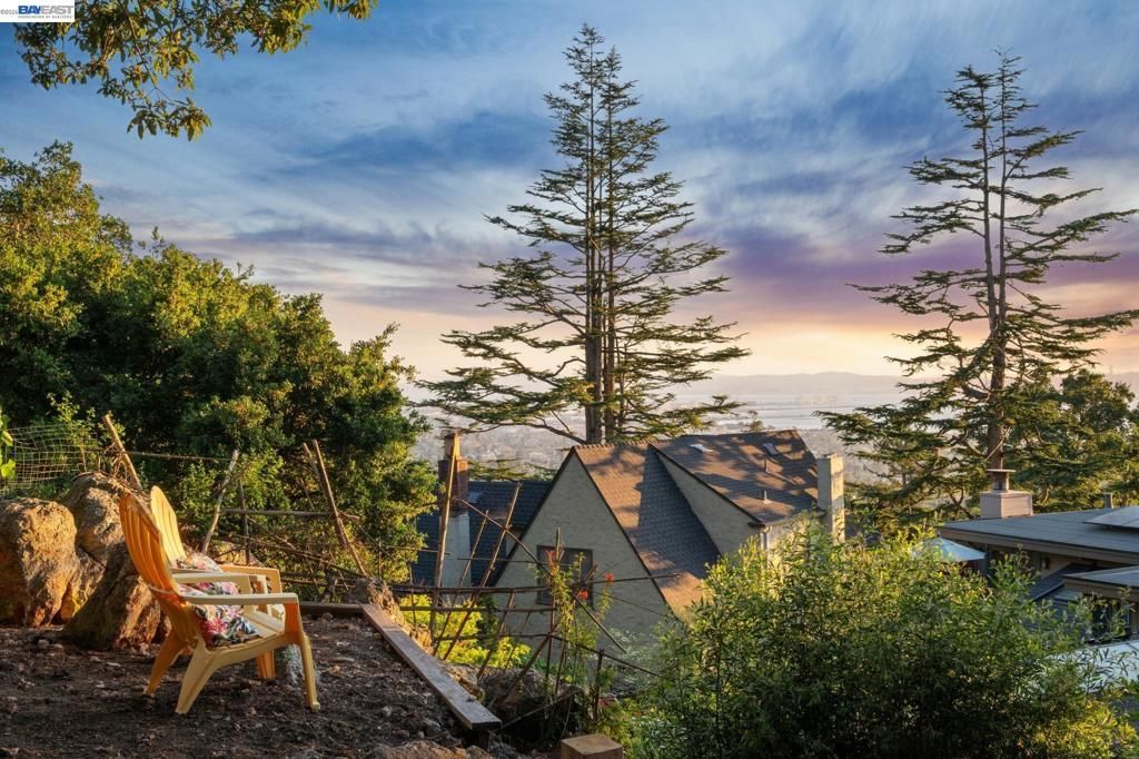 In the exquisite Berkeley Hills Cragmont neighborhood, this wonderful 2+BD/2.5BA Mid-century home offers stunning San Francisco Bay views and a great Berkeley lifestyle. Sunlight splashes onto the hardwood floors of the 1338 SQFT home, where tree top and the Golden Gate views are your backdrop in the open living room and dining area. The adjacent eat-in kitchen enjoys two sinks, views of the expansive backyard with Berkeleys signature glacial erratics and rock formations. Dine on the patio, garden in the raised beds, or relax in the shade of old oaks on the upper patios where the amazing views invite you to unwind and admire the beauty of the Bay. Back inside, one sunny bedroom has a hall bath, while the primary bedroom features an ensuite bath and a sliding door onto the back patio. The separate downstairs bonus space offers a private entrance and a powder room, making it a great place to work from home or house a guest. Laundry, storage, and a 1-car garage are also downstairs. Cragmont is known for its coveted elementary school and beautiful rocky parks. Out your front door, explore wonderful parks, or visit magical Tilden with trails, golf course, swimming, and Little Farm. Down the hill are the world class amenities of Berkeley, including Cal campus & BART. Energy Score: 2.