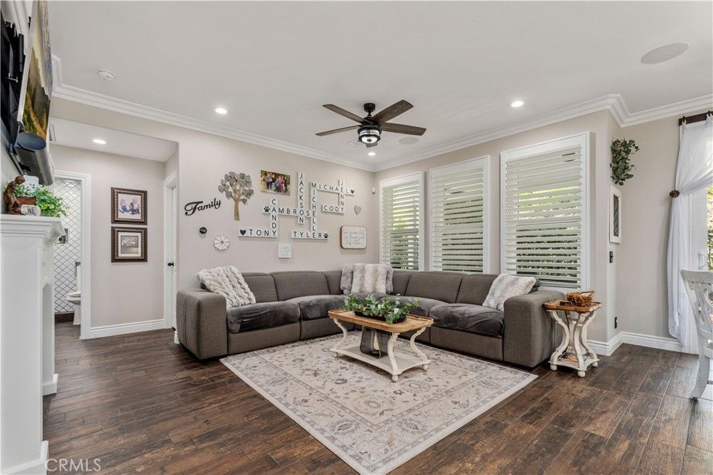Welcome to 8750 E Heatherwood Rd, a beautifully remodeled 5-bedroom, 3-bathroom home in the desirable Cambria tract of Anaheim Hills. With 2,300 sq ft of modern living space, this residence offers a perfect blend of elegance and comfort. Enter into the formal living room featuring recessed lighting, custom cabinetry, and plantation shutters. A high-volume ceiling separates the living room from the dining area, enhancing the open feel. The lower level boasts wood-look tile flooring throughout, adding a touch of warmth. The remodeled kitchen is a chefs delight, equipped with custom white shaker cabinets with bronze handles, white quartz countertops and backsplash, stainless steel appliances, and recessed lighting. Enjoy the walk-in pantry, center island with pendant lights, breakfast bar, nook, and custom range hood. A sliding glass door leads to the backyard patio, perfect for entertaining. The family room offers custom cabinets, a fireplace, surround sound, and crown molding. A main floor bedroom with recessed lighting, ceiling fan, custom cabinets, and a remodeled 3/4 bath provides convenience and flexibility. Perfect for Mother in Law suite, office or bedroom. Ascend the staircase with its elegant wrought iron and wood handrail to the second floor, featuring wood-look tile flooring throughout. The hallway offers ample custom cabinetry for storage. Four spacious bedrooms, all with recessed lighting and ceiling fans, provide comfort and privacy. The hall bath is remodeled with new vanities, dual sinks, tile surrounding the tub and one wall, and a custom glass shower door. The expansive primary suite features recessed lighting, a ceiling fan, and two walk-in closets. The primary bath includes a separate shower, soaking tub, dual sink vanity, ceiling fan, and recessed lighting. A dedicated desk area in the hallway is perfect for a home office. The second-level laundry room has tiled walls, a butcher block shelf above the washer and dryer, custom shelving to hang your laundry and tile flooring. The backyard features a covered patio with recessed lighting and a ceiling fan, ideal for outdoor gatherings. Multiple seating areas offer versatility for relaxation and entertaining. Additional amenities are CAt 5 wiring, tankless water heater, soft water system, plantation shutters throughout and under stairs custom storage, playhouse or dog crate. Conveniently located close to the elementary school, parks, hiking trails, shopping, and freeway access.