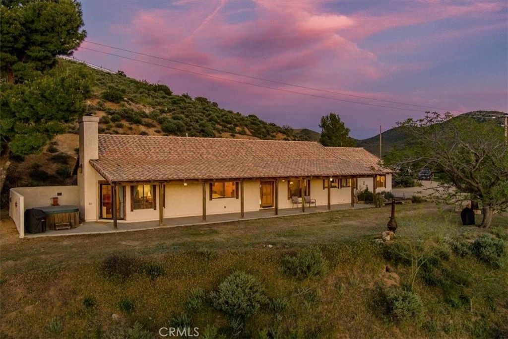A private 2.5-acre country ranch style home with a million-dollar view awaits you located in the heart of Agua Dulce. This beautifully maintained property built in 1992 features 3 bedrooms and 2½ baths and is single level accessible. Saltillo tiles enhance the spacious country kitchen which opens onto an open dining area. The generous living room and primary suite both are warmed by romantic woodburning fireplaces and hardwood flooring. A covered patio surrounds the front of the property with a spa conveniently located off the primary suite. With a potential for horse facilities and plenty of parking, there is plenty of space to spread out. Owned Tesla batteries for exceptional backup makes this a haven for working from home. A well and 250-gallon propane tank as well as interior sprinklers and dual paned windows are features that make this home a perfect fit. With convenient access to Los Angeles and the San Fernando Valley, access to the property is up a mile and a half of well-groomed decomposed granite road. A peaceful rural lifestyle.