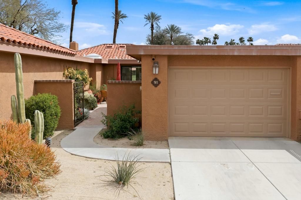 Open House March 7th 11am to 2pm. 91 La Cerra Dr. is located in Sunrise CC on a single sided street adjacent to Thunderbird Terrace. This area benefits from fewer neighbors and traffic then other sections of the club. Tastefully updated with a few well thought modifications to the interior. The kitchen has been opened for easier access and a neat dry bar with wine cooler has been added. Immaculate 2 bedroom 2 bath condo with interior location in Sunrise CC. Eastern Golf course views from the living area and back patio, Mountain views in the large front courtyard. The current owner is a landscape designer and has nurtured a one-of-a-kind garden in the front courtyard. The Primary bedroom has walk in closet plus an extra closet with built ins. Ideal Rancho Mirage location, near The River, The Gardens on El Paseo, Annenberg Estate, Disneys Cotino, dining, shopping and Eisenhower Hospital.